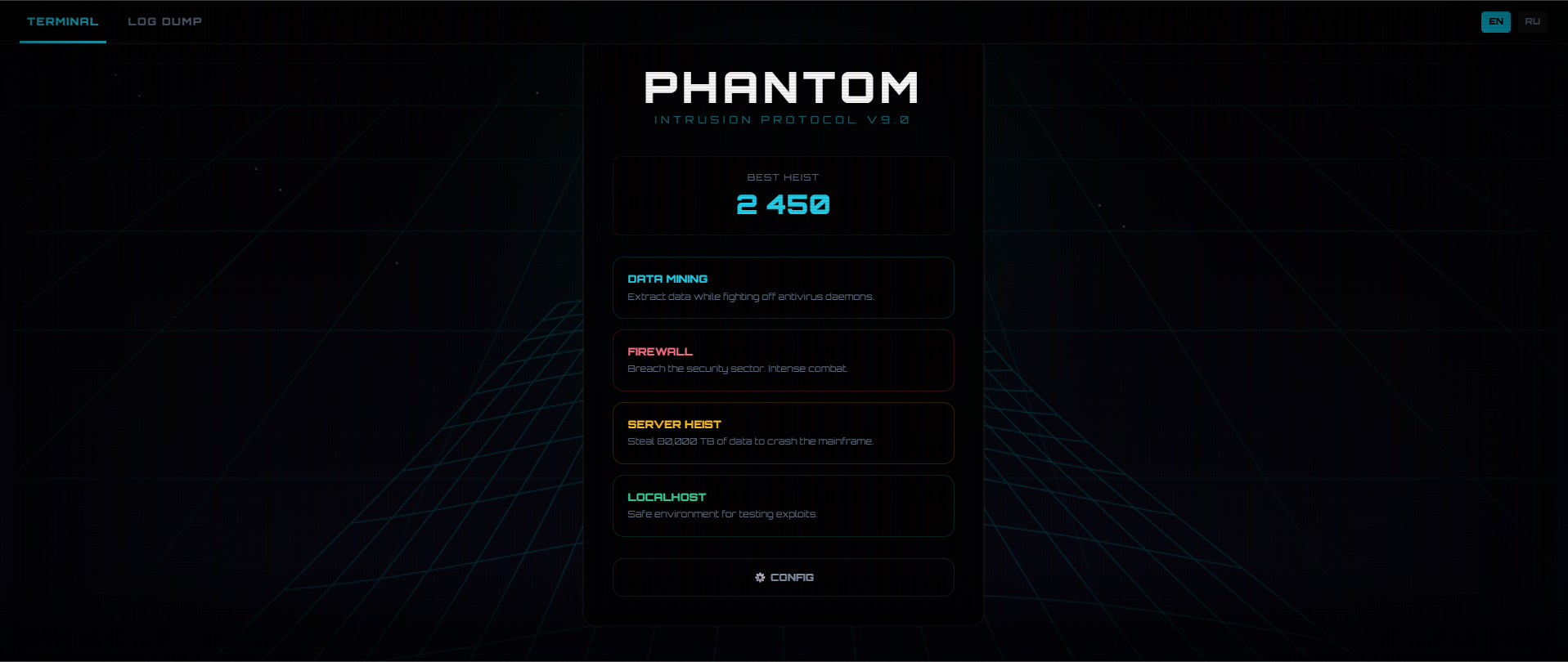 Hack the system from within. PHANTOM: a dynamic retro-terminal cyber-shooter. You are the virus. Disable the firewall. Survive deletion